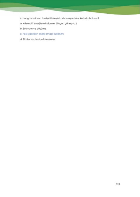 6. Hangi ana insan faaliyeti bireyin karbon ayak izine katkıda bulunur? a. Alternatif enerjilerin kullanımı (rüzgar, güneş vb.) b. Solunum ve büyüme c. Fosil yakıtların enerji amaçlı kullanımı d. Bitkiler tarafından fotosentez 126